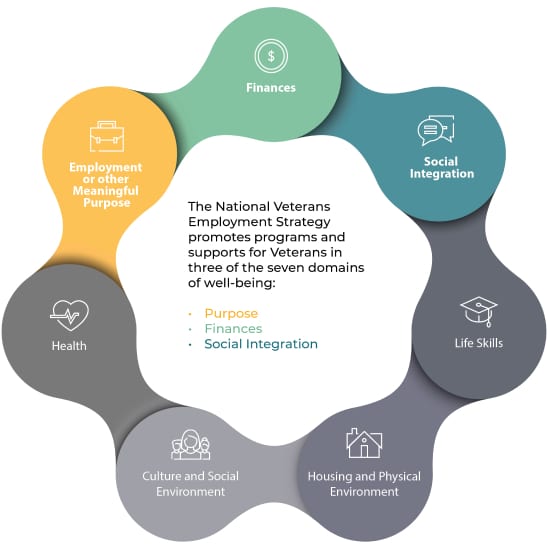 Our programs and services are designed to support the 7 domains of well-being as described by Veterans Affairs Canada (VAC). The 7 domains include:
